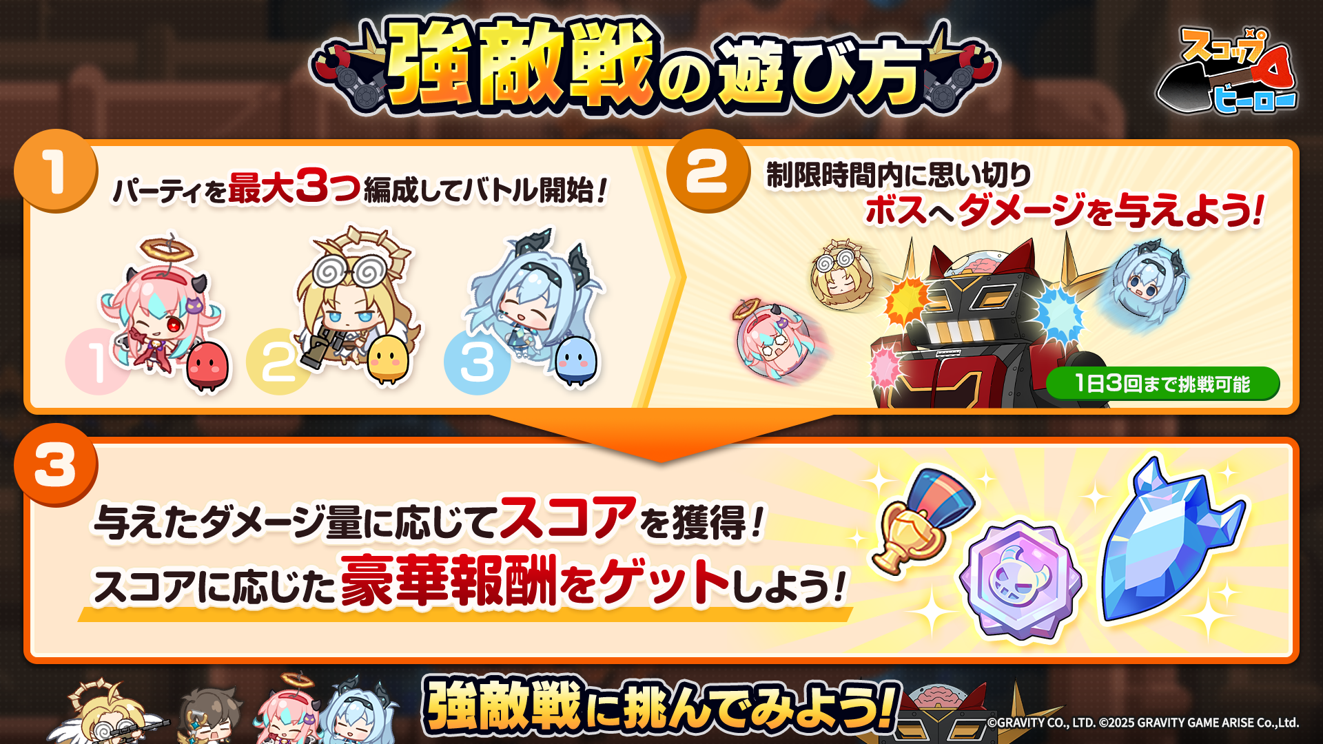 ハイスコアを狙うもよし!コツコツ挑むもよし!強敵に挑んで、豪華報酬をゲットしよう!